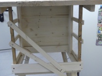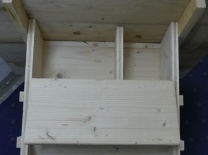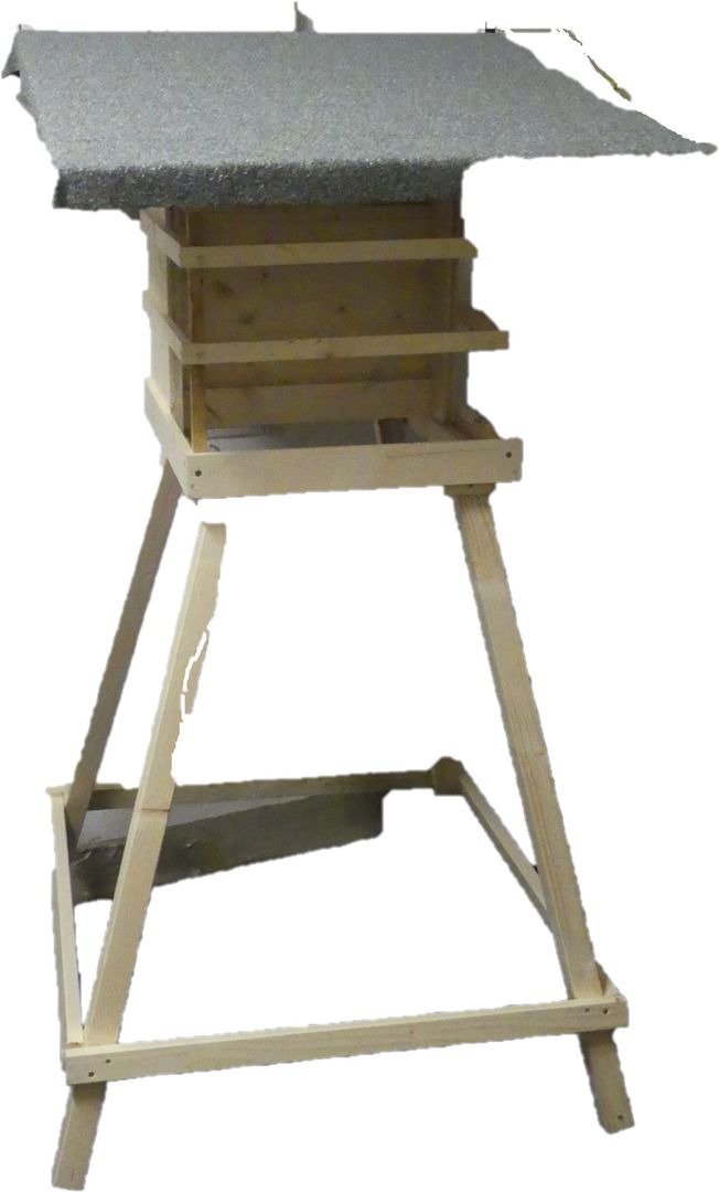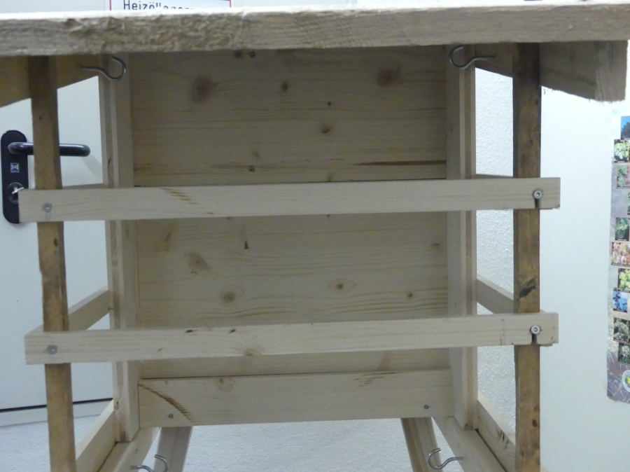 Eine Futter-Rinne ergibt sich durch ein schmales waagrechtes Brett unter dem Ende der schrägen Rückwand und ein schmales senkrechtes Brett auf dem waagrechten Brett.