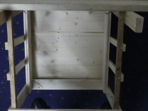 Also beginnt man, zwischen den zwei Seitenwänden ( im Beispiel 25 x 50 cm ) die einteilige Vorderwand und die 3-teilige Rückwand zu montieren, wobei die Futterklappe nicht fest montiert, sondern mit Scharnieren an dem darunter liegenden Teil der Rückwand so anzuschlagen, dass die Klappe leichtgehend abgeklappt werden kann.