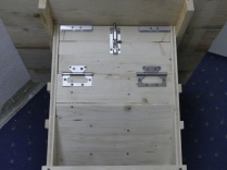 Wie Sie auf dem Foto erkennen können, wurde die Anlage so gebaut, dass 2 verschiedene Futtersorten einfach durch ein Brett getrennt angeboten werden können ( z.B. Sonnenblumenkerne und Getreidekörner ).